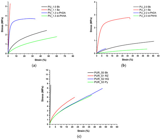 Comparative results for tensile test: (a) PU_1 series, (b) PU_2 series, and (c) PUR series.