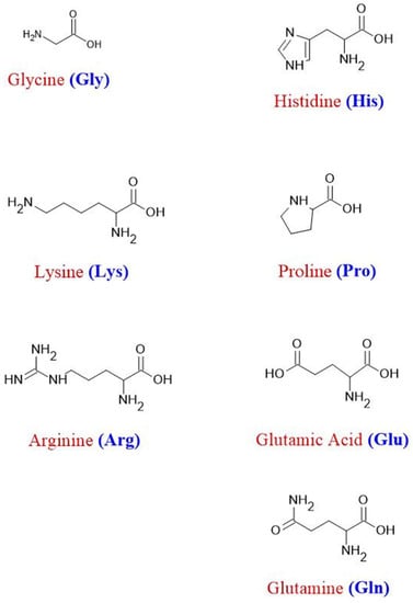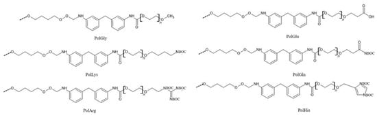 Using the reaction mechanism illustrated in Scheme 6, one can obtain glycine, lysine, histidine, glutamine, glutamic acid, proline, and arginine functional groups terminating PEG units. The chemical structures of the obtained products are depicted in Scheme 7.