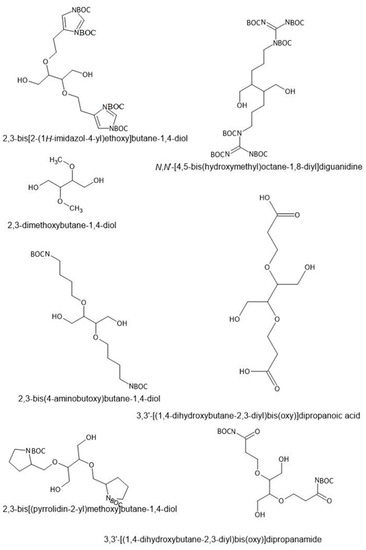 The new chain extenders will be synthesized using all seven structural-breaking amino acid residues’ functional groups. Specifically, the functional groups of amino acids will be modified with 2,3-dibromobutane-1,4-diol for obtaining the bio-inspired intrinsically disordered polymers. For this purpose (as shown in Scheme 2), the functionalization reaction will be carried out in two steps. In the first step, the acidic solution of the functional group salt will be titrated with an aqueous solution of cesium carbonate for activating the hydroxyl group. Next, the solvent will be evaporated and the obtained product will be stored in a desiccator for usage in the second step of the functionalization. In the final step, the obtained product will react with 2,3-dibromobutane-1,4-diol (1:1 molar ratio) under an inert atmosphere at 50 °C in an oil bath for 3 h. The resulting product is then attained by the extraction in the presence of dichloromethane (DCM). Tert-butyl hydrogen carbonate (BOC) will be utilized for protecting the amine groups. The synthesized new seven chain extenders are shown in Scheme 3. These new chain extenders will be used in the syntheses of a polyurethane-based new class of intrinsically disordered polymers.