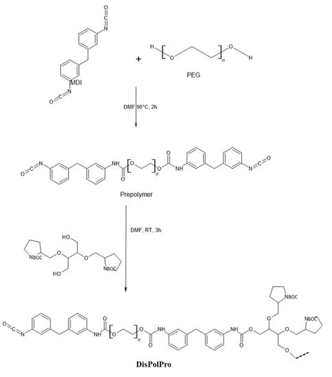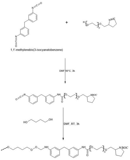 Polymerization reaction mechanism of the new proline functional group terminated PEG and diisocyanate.