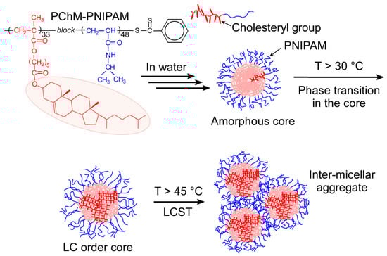 Thermo-responsive poly(N-isopropyl acrylamide) (PNIPAM) exhibits a lower critical solution temperature (LCST) in water [25,26,27,28]. PNIPAM can dissolve in water below the LCST because the pendant amide groups are hydrated through hydrogen bonding interactions with water molecules. Above the LCST, the pendant amide groups are dehydrated because of the increased molecular motion to destroy the hydrogen bonding interactions with water molecules, and PNIPAM cannot dissolve in water. The thermo-response behavior of PNIPAM has been applied in the fields of medicine, pharmacy, and engineering [29]. Boissé et al. [30]. reported the association behavior of amphipathic diblock copolymers composed of the hydrophobic cholesteryl groups-containing block exhibiting liquid crystallinity and the thermo-responsive poly(N,N-diethylacrylamide) (PDEA) block. The amphipathic diblock copolymers form fibers with a smectic ordered structure because of the mesogenic cholesteryl groups in water. Above the LCST, PDEA on the fiber surface became hydrophobic and aggregated to form a precipitate.