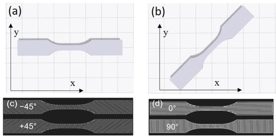 Schematic of sample layouts on the printing platform: (a) [+45, −45] and (b) [0, 90]. The raster’s arrangement within two consecutive layers: (c) [+45, −45] and (d) [0, 90].