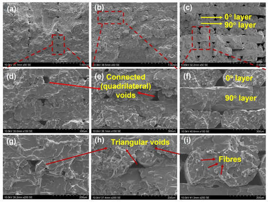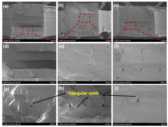 The structure of the printed [0, 90] composite samples with different layer thickness: 50×: (a) 0.1 mm, (b) 0.125 mm, (c) 0.2 mm; 150×: (d) 0.1 mm, (e) 0.125 mm, (f) 0.2 mm; 250×: (g) 0.1 mm, (h) 0.125 mm, (i) 0.2 mm.