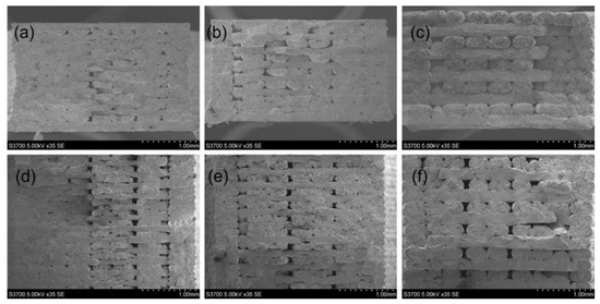 SEM images (35×) of the structure of the printed [0, 90] composite samples with different thickness: 2 mm: (a) SFRN_0.1, (b) SFRN_0.125, (c) SFRN_0.2; 4 mm: (d) SFRN_0.1, (e) SFRN_0.125, (f) SFRN_0.2.