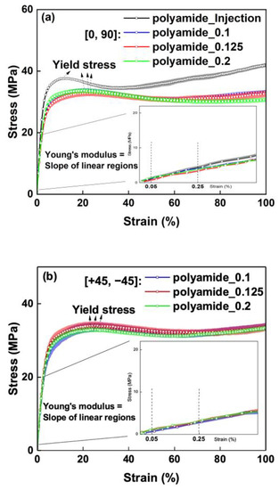 The stress–strain curves of the fabricated samples with 3 mm thickness are plotted in Figure 7. The standard deviation of each sample (six specimens) is presented by the upper and lower bounds of the stress–strain bands. Strain values obtained from the video extensometer and tensile properties (yield stress and tensile modulus) were determined from the stress–strain curves.