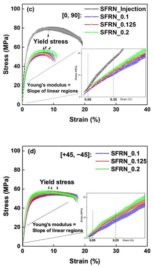 The strain–stress curves of the fabricated samples with 3 mm thick: (a) injection-moulded and [0, 90] polyamide; (b) [+45, −45] polyamide; (c) injection-moulded and [0, 90] SFRN; (d) [+45, −45] SFRN.