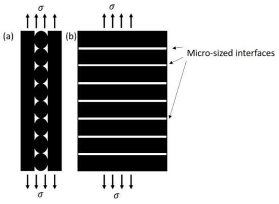 As discussed above, inferior interfaces with a larger size were found between adjacent SFRN filaments compared to the polyamide, resulting in a more significant reduction in the tensile properties. The partial bonded interfaces may continuously distribute along the filament direction, and therefore the printed [0, 90] and [−45, +45] samples may consist of 90° and 45° interfaces relative to the tensile load, respectively. The load transfer in laminates subject to the tensile load is degraded due to the off-axis pre-existing defects where the load carried by the layers is transferred to the neighbouring layers. The degraded load transfer resulting in the reduction in stiffness is described by various approaches such as shear-lag models [76,77,78], McCartney’s models [79] and crack-opening-displacement models [80]. The schematic of the transverse interfaces in [0, 90] samples is shown in Figure 9. The transverse interfaces may also influence the load transfer of the printed samples subject to tensile load, and then lead to the reduction in the tensile modulus.