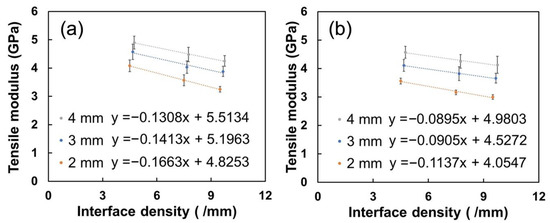 The tensile modulus of the printed SFRN samples as a function of interface density: (a): [0, 90] SFRN; (b): [+45, −45] SFRN.