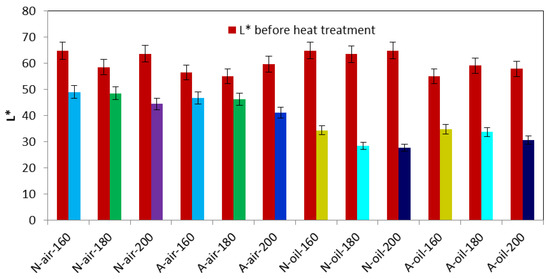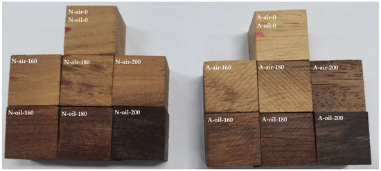 In addition, we found that the darker shade was more pronounced for the palm oil heat treated wood (Figure 2). This is probably caused by the caramelization of sugars resulting from the degradation of hemicelluloses by palm oil, which largely depends on the treatment temperature [45]. Additionally, Afrormosia heat-treated under air blackened more than Newtonia treated under the same conditions. This tendency was reversed under heat treatment conditions with palm oil. The first case is justified by the fact that Afrormosia is naturally darker than Newtonia, which is characterized by the lower values of L* in Afrormosia than in Newtonia before treatment. The second case suggests that the caramelization of sugars resulting from the hydrolysis of hemicelluloses is more accentuated in Newtonia than in Afrormosia [26]. We have also noticed that the samples in the palm oil medium were blackened more than that in the air medium. This phenomenon can be explained by the auto-oxidation of unsaturated fatty acids and their derivatives from palm oil [11]. In sum, heat treatment under air and palm oil makes the wood blacker (Figure 1).