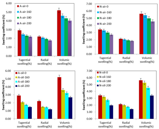 It is therefore clear that wood swelling is closely related to wood direction, treatment temperature and wood species. Afrormosia and Newtonia, like most woods, have less dimensional stability in the tangential direction than in the radial direction when absorbing water due to increased environmental relative humidity. Heat treatment with air or palm oil reduces the tendency for dimensional changes in the tangential and radial directions in proportion to the increase in processing temperature. In addition, swelling is mainly due to the increase in the distance between cellulose microfibrils in the wood cell wall caused by absorbed water [47]; thus, it seems that this distance is greater in Newtonia wood than in Afrormosia wood. This could explain why Afrormosia dimensions were better stabilized than Newtonia during heat treatment. The improvement in swelling observed for both air- and oil-treated samples is due to a decrease in the hydroxyl groups of the less thermally stable hemicelluloses having active sorption sites available in the wood cell walls. This improvement is also due to a reorganization of the chemical structure of the less ordered amorphous cellulose leading to a more ordered and hydromorphic crystalline cellulose, as this leads to a further reduction of available sorption sites [48]. Finally, the improvement in swelling can also be explained by crosslinking caused by the polycondensation reactions in lignin [26]. We found that heat treatment under palm oil stabilizes the wood better than heat treatment under air. This is explained by the fact that in heat treatment with palm oil, oil absorption is accompanied by oil deposits in the cell wall and this leads to the formation of a protective layer on the wood against water [26]. However, the oil absorbed by the wood is much less important for swelling than for water absorption [27].