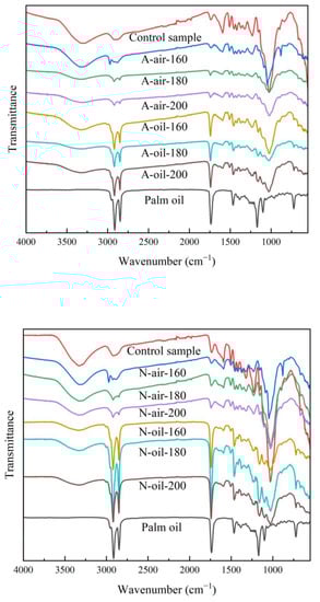 The analysis of the FTIR spectra was applied to all the different samples and was performed between the wavelengths of 4000 cm−1 and 400 cm−1. Regardless of the wood species and the treatment temperature, the general shape of the spectra remained similar when treated with the same heat transfer fluid (Figure 8). Around 3300 cm−1, we identified a broad band of OH stretching vibration in air and palm oil heat treatments [3]. This band decreased with increasing treatment temperature regardless of the heat transfer fluid used, indicating a decrease in OH groups in the wood samples. In other words, this means that heat treatment with air or palm oil reduced the hygroscopic capacity of Afrormosia and Newtonia wood and that this reduction was directly related to temperature and did not necessarily depend on the treatment medium, thus highlighting the degradation of hemicelluloses [52]. From 1260 to 1460 cm−1, medium intensity bands were observed, reflecting the vibrational stretching of hydroxyl bonds of primary, secondary, tertiary and aromatic alcohols. These bands were more accentuated for samples treated with palm oil and the intensity of these bands also decreased with increasing temperature. On the other hand, the broad band of high intensity with valence vibration located between 1030 cm−1 and 1050 cm−1 show the C-OH bonds of alcohols, the C-O bonds of ethers and the β-O-4 linkages in lignin. We found that this band decreases for treatment with temperatures below 200 °C but increases for wood treated at 200 °C. This increase suggests the generation of primary alcohols and likely results from the degradation of cellulose and hemicelluloses [25]. In addition, it also suggests the cleavage of β-O-4 bonds and the cleavage of methoxylates from lignin. Similar results have been found by Sikora [38]. We also identified a broad band of high intensity located between 2850 cm−1 and 2900 cm−1 that highlights the presence of C-H bonds of aldehydes [52]. The intensity of this band was stronger for the samples treated under palm oil. This is probably due to the use of palm oil. The fine band of high intensity observed around wavelength 1740 cm−1 of the wood samples treated with palm oil reflects the modification in carbohydrates (in hemicelluloses) by oxidation, of the content of C=O bonds of carboxylic acids due to palm oil [48,52,53]. The band at 1505 cm−1, which highlights the vibrational stretching of aromatic skeletal C=C in lignin, is more accentuated for palm oil heat treatment, implying that this treatment degrades the wood lignin more than air heat treatment. Indeed, methoxyl groups and syringyl units degrade faster than guaiacyl at high temperatures. In other words, palm oil at high temperature, more than air, favors the cleavage of methoxyl groups or the loss of syringyl units [38].