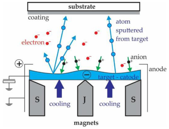 Magnetron sputtering is a process where the material is vaporised by bombarding the target material with high-energy ions (Figure 1). The process takes place in a vacuum-sealed chamber, where there is an inert gas, substrate, and material for the coating [27]. A static magnetic field is formed in the chamber, which keeps the electrons close to the surface of the cathode, where the ionisation increases and forms a dense plasma. The plasma contains an ion with which the target is sputtered [41]. According to this principle, solid single or multi-layer coatings are prepared by magnetron sputtering. In the presented study, this process was used for all three coatings.