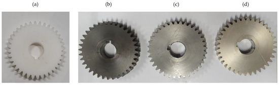 Tested gears made of POM: (a) Without coating, (b) CrN-coating, (c) Al-coating, (d) Cr-coating.