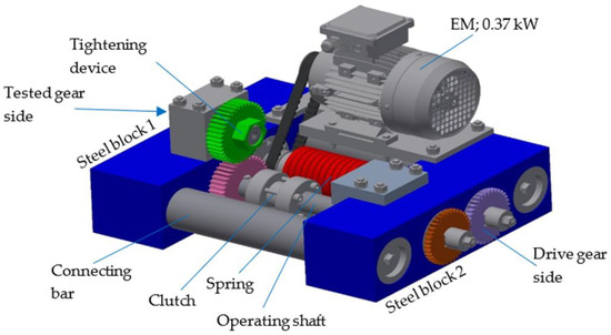 The gears were tested on an in-house developed testing device, as shown in Figure 3. The testing device consists of two rigid steel blocks, which are connected firmly with two connecting bars; together, they form the rigid frame of the whole construction. The closed-loop consists primarily of two operating shafts connected with two gear pairs. During the experimental testing, the tested pinion made of POM was meshed with a support gear made of steel (the basic parameters of the gears are presented in Table 3). The rotational speed was set to n = 1000 rpm. A torque T = 20 Nm was applied with a plain digital torque wrench through the gear with a wrench gap at the accessories for working torque, which consisted of a one-way Clutch Bearing CSK 35 to avoid the back rotation of the shaft. Once the desired torque was applied, the clutch was closed and the tightening device could be removed.