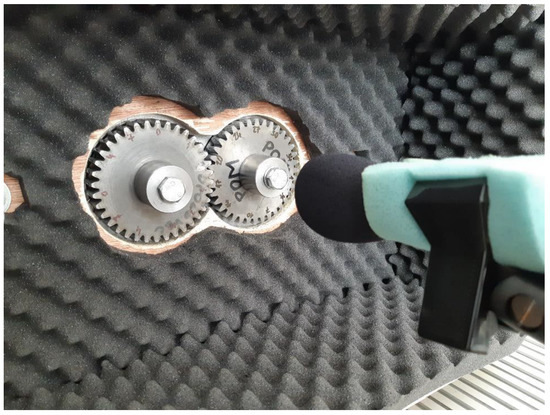 The testing gears were protected with a sound-proof acoustic foam in order to decrease the noise caused by the electric motor, bearings, and toothed belt with pulley. Thus, the tested gears worked similar to a semi-anechoic chamber (see Figure 4).