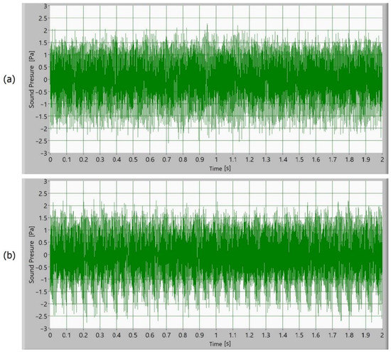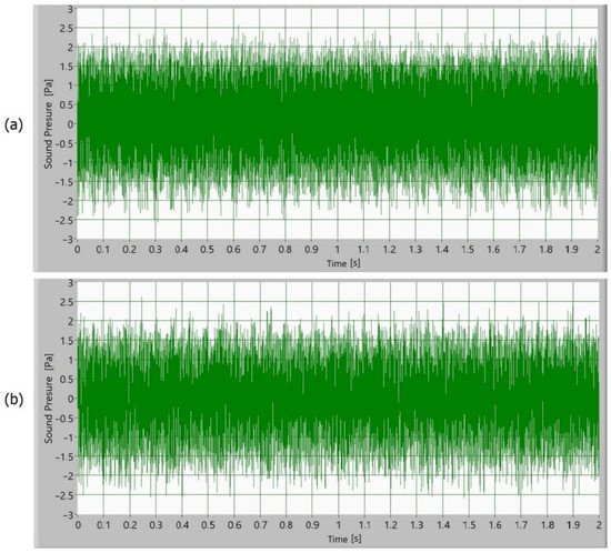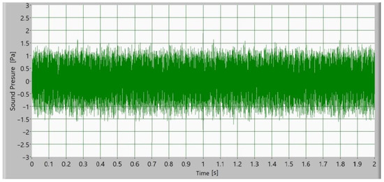 The National Instruments NI PXI 4472 system and the AP 7046 microphone with PS9200 power supply were used to measure sound pressure. By increasing and reducing the distance of the microphone, the sound pressure level changes, and it is decreased with distance. Therefore, it is required to carry out all the measurements at a certain constant distance. The measurement of sound pressure level depends on several factors, i.e., on the source distance from the microphone, the direction of measurement, and the acoustics of the environment. However, the microphone distance can be reduced to a minimum, i.e., it can be very near the field of vibrating surfaces in order to avoid the problems of acoustic background. Getting very near the field of vibrating surfaces also depends on the mechanical source of vibrations and disturbances in the acoustic field between the source and the microphone. In our case, we placed the microphone at a distance of 100 mm, which was within the measuring space/housing protected with sound-proof acoustic foam, which is similar to a semi-anechoic chamber. The LabView software was used to analyse the signals that were then analysed in the time, frequency, and time–frequency domains by a program, which was developed on the basis of a LabView professional software version.