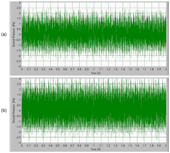 Time signal of sound pressure for polymer gears with Al-coating with (a) 3-layer coating and (b) 5-layer coating.