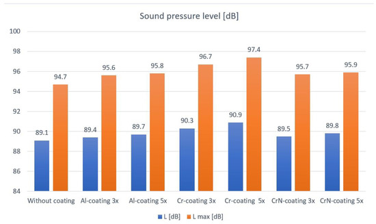 Figure 9 presents the sound pressure levels L and Lmax of polymer gears with or without different coatings for different coating layers. Sound pressure measured in Pa is the dynamic variation in the static pressure of air. In order to obtain a sound pressure level, the instantaneous sound pressure is averaged over a certain duration. The sound pressure level is usually represented on a logarithmic amplitude scale, similar to the human perception of hearing.