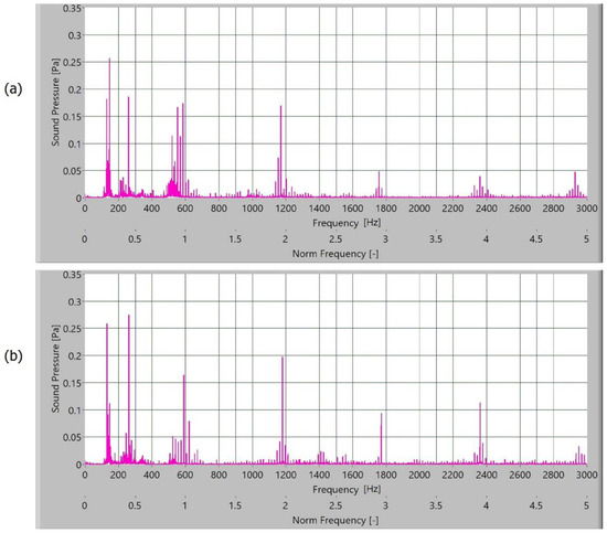 Frequency spectrum of sound pressure for polymer gears with Al-coating, with (a) 3-layer coating and (b) 5-layer coating.