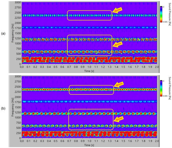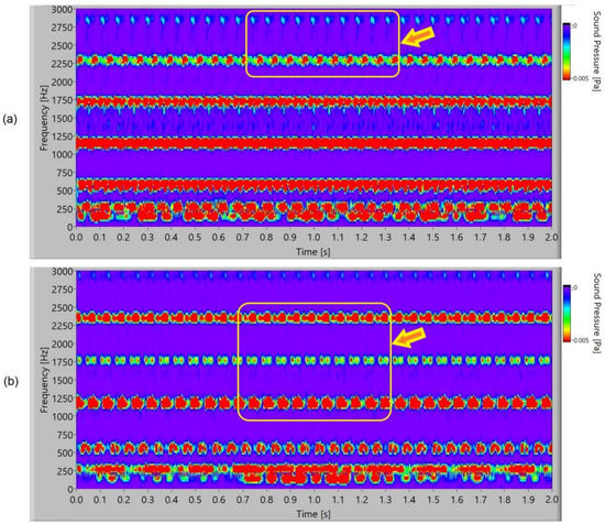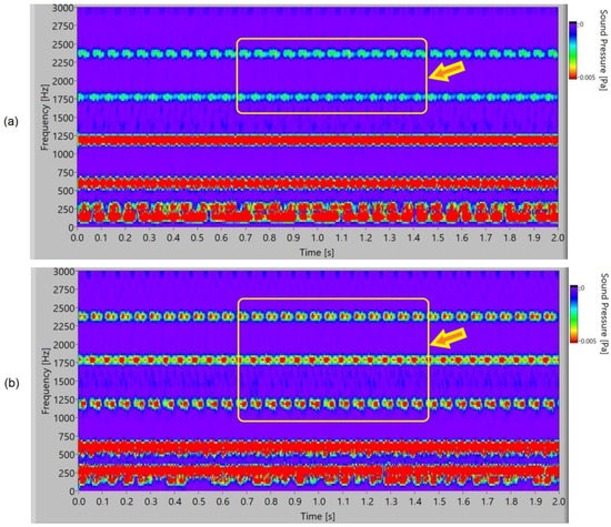 Frequency spectrogram of sound signal for polymer gears with Al-coating: (a) 3 layers; (b) 5 layers.