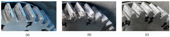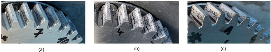 Analysis in the time–frequency domain is a powerful tool for identifying the presence of pulsation for typical frequency components. Typical intensities and classification of pulsation are connected with friction because the slip-stick effect or moving and stopping the tooth flank on the surface contact is dominant. As the wear resistance and durability of specific coatings are different, this leads to peeling with different phenomena. Peeling parts with specific shape, size, and strength cause hacking into the teeth surface, accumulation, and sticking into the contact meshing point of the teeth flank. The degradation of the coated surface with peeling for polymer gears with 3-layer coatings after 22 min is presented in Figure 18, and that for polymer gears with 5-layer coatings is presented in Figure 19. It is evident that the surface degraded with peeling more than 90% in the case of polymer gears with 3-layer coatings and more than 85% in the case of polymer gears with 5-layer coatings.