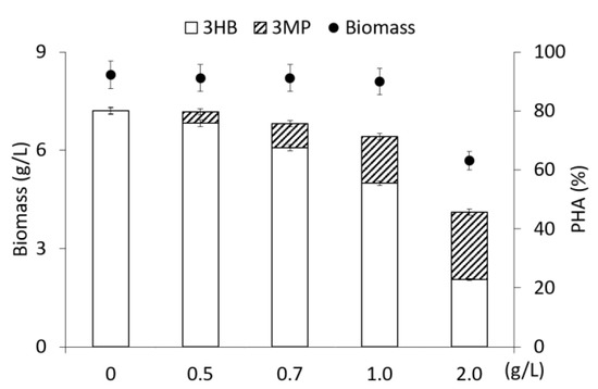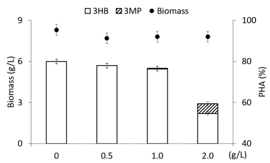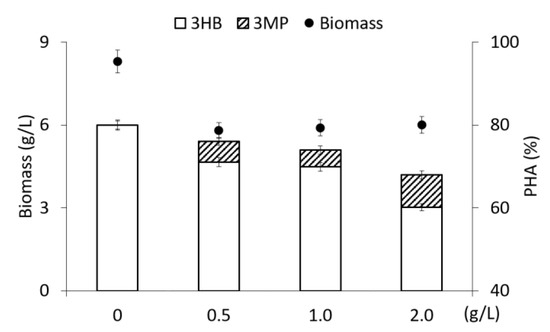 Subsequent increase in the concentration of the precursor substrate to 2.0 g/L inhibited bacterial growth and polymer synthesis. Additionally, biomass concentration and polymer content decreased to 5.7 g/L and 45.6%, respectively. It is known that thiols, which include 3-mercaptopropionic acid, are the cause of oxidative stress in bacterial cells as a result of the induction of reactive oxygen species [47] and 3MP, especially when converted to 3MP-CoA, has an inhibitory effect on the enzymes of reactions β-oxidation [48].