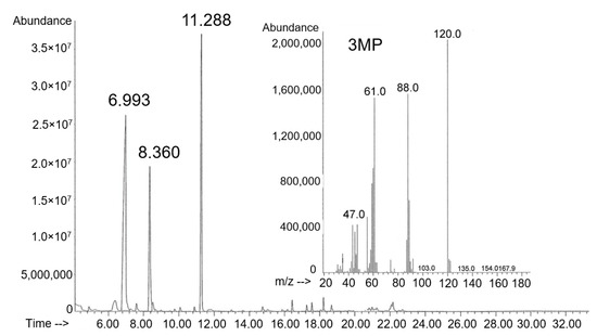 The presence of 3MP monomers in PHA samples synthesized on a medium with the addition of 3-mercaptopropionic acid was confirmed by chromatographic analysis and mass spectra. To determine the composition of PHA samples synthesized by C. necator B-10646 on fructose supplemented with 3-mercaptopropionic acid at various concentrations, we analyzed not only the biomass of bacteria, but also polymer samples isolated from cells and purified (Figure 2).