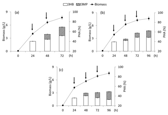 Figure 3. Biomass concentration of bacteria Cupriavidus necator B-10646, content and composition of PHA in experiments with fructose as the main C-substrate and addition of 3-mercaptopropionic acid at different concentrations: (a)—1.0 + 1.0; (b)—0.5 + 1.0 + 2.0; (c)—0.5 + 2.0 + 2.0 g/L; (the time of supplementation is shown by arrows).