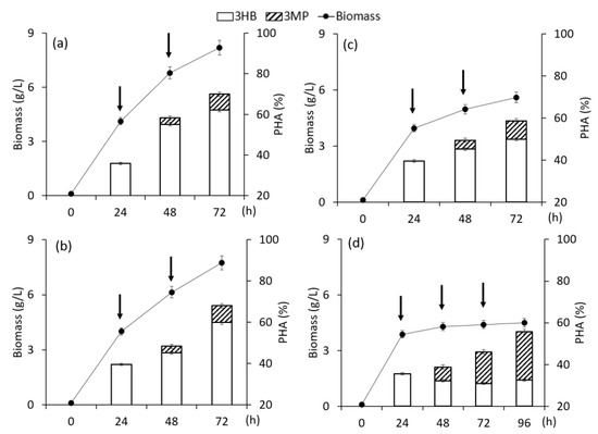 Figure 6. Biomass concentration of bacteria Cupriavidus necator B-10646, content and composition of PHA in experiments with fructose as the main C-substrate and addition of 3,3′-thiodipropionic acid acid at different concentrations: (a)—1.0 + 1.0; (b)—1.5 + 1.5; (c)—2.0 + 2.0; (d)—2.0 + 2.0 + 2.0 g/L; (the time of supplementation is shown by arrows).