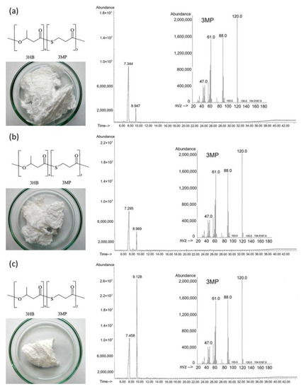 Figure 7. Photographs, structural formulas and chromatograms with mass spectra of the P(3HB-co-3MP) samples synthesized by Cupriavidus necator B-10646 using various 3MP monomer precursors: (a) 3-mercaptopropionic acid, the content of 3HB and 3MP monomers is 95.50 mol.% and 4.50 mol.%, respectively; (b) 3,3′-dithiodipropionic acid, the content of 3HB and 3MP monomers is 88.47 mol.% and 11.53 mol.%, respectively; (c) 3,3′-thiodipropionic acid, the content of 3HB and 3MP monomers is 61.0 mol.% and 39.0 mol.%, respectively. The retention time of the 3HB and 3MP monomers is 7.295–7458 and 8.947–9.128, respectively.