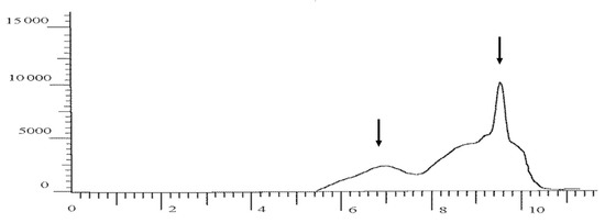 Thus, with a single addition of 3-mercaptopropionic acid to a bacterial culture at a concentration of 0.7 g/L, the Mn and Mw values were 46 kDa and 202 kDa, respectively, and the polydispersity was 4.4. With an increase in the concentration of 3MP monomers to 2.0 g/L, the polydispersity of the polymer increased very significantly to 11.8, due to a decrease in Mn to 29 kDa. At a higher concentration of 3-mercaptopropionic acid (3.5 g/L) fed into the medium fractionally, the copolymer had higher Mn (73 kDa) and Mw (571 kDa) values, with the polydispersity value was still high (7.8). It was found that the sample No. 3 P(3HB-co-3MP) was synthesized by fractional addition of 3-mercaptopropionic acid (total concentration 4.5 g/L) to the culture is represented by two fractions with different values of molecular weights and polydispersity (Figure 8). The values of Mn for the low and high molecular weight polymer fractions were 35 kDa and 444 kDa, respectively. The ratio of these two fractions in the polymer was uneven; the low molecular weight polymer fraction dominated, amounting to 78%. Previously, we also showed that under certain conditions the synthesized polymer can be formed by two fractions with different molecular weight characteristics [52].