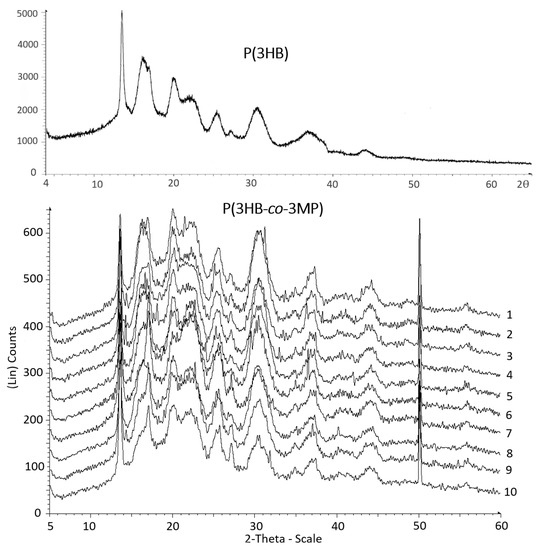 We did not find quantitative data on the degree of crystallinity of P(3HB-co-3HV) copolymers in the available literature. At the same time, in several works of colleagues from Germany, it was shown that the X-ray diffraction pattern of the poly(3HB-co-3MP) copolymer containing thioether bonds differs significantly from that of the P(3HB) homopolymer. X-ray diffraction patterns of samples with significantly different contents of 3MP monomers were taken and studied [31]. X-ray diffraction powder patterns of samples with the highest content of 3MP monomers (34.9 mol.%, 40.4 mol.% and 42.5 mol.%, respectively,) showed a sharp peak at 21.3°, 2θ which is not on X-ray diffraction patterns of P(3HB). However, it was absent in X-ray diffraction powder patterns of sample with the lowest content of monomers 3MP (4.6 mol.%) and the X-ray pattern completely coincided with that of P(3HB).