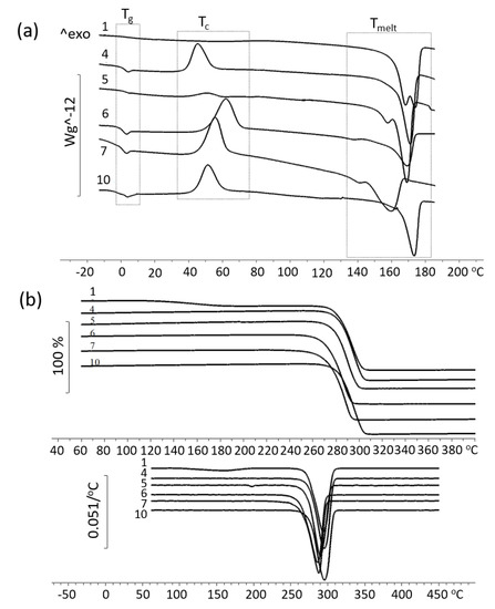 Figure 10. Temperature characteristics of P(3HB-co-3MP) samples with different sets of monomers: (a) DSC curves with glass transition temperature (Tg), crystallization temperature (Tcryst) and melting point (Tmelt) regions; (b) thermal stability (TGA) (sample numbering according to Table 2).