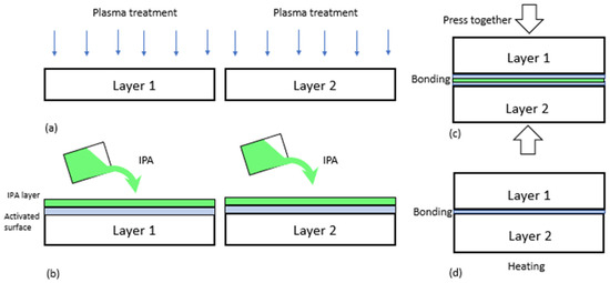 The existing approach of oxygen plasma bonding. (a) Surface activation process inside a vacuum chamber, (b) wetting of layers using solvents (e.g., IPA, DI water) to inhibit hydrophobic recovery to facilitate the alignment of two pieces or layers of materials, (c) bonding by pressing the two layers, (d) post heating to remove volatile components.
