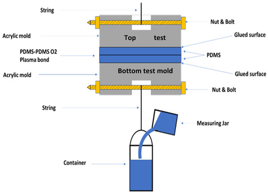 The bonding strength of PDMS to PDMS was measured by using a custom-made simple setup for tensile testing (Figure 3). The bonded PDMS-to-PDMS slabs were glued (J-B Weld 50139 Adhesive) to the top test and bottom test molds, respectively, as illustrated in Figure 3. The mold is made of acrylic, which was chosen due to its availability. Each contact area between PDMS and the mold was 25 mm2. Bolts were inserted inside the mold, as illustrated in Figure 3. The whole test system was cured in a vacuum chamber for 24 h. After that, the bonding strength was evaluated in the following way. The container connected to the sample was slowly filled with water until the release of the bond. The tensile force on the bond was the weight of the container’s water at the bond’s breakage point. The tensile force on the bond was the weight of the water in the container at the breakage point of the string. The tensile strength of the bond was then calculated by dividing the force by the contact area (i.e., 25 mm2). The foregoing measurement was performed at Canadian Light Source (CLS) facilities located in Saskatoon, SK, Canada.
