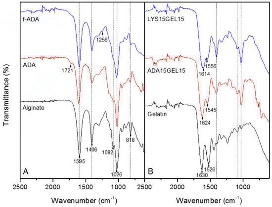 ATR−FTIR spectra of sodium alginate, ADA, and l-lysine−functionalized ADA (A) and ADA15GEL15, LYS15GEL15, and gelatin (B). The dash represents the alginate’s characteristic absorption peak.