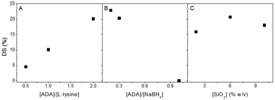 Degree of substitution (mmol %) as a function of the concentration of l-lysine (mmol) using 3 mmol of NaBH4 and 6% (w/v) SiO2 (A), NaBH4 (mmol) using 1 mmol of ADA and 6% (w/v) SiO2 (B), and 2,6, and 10% (w/v) SiO2 using 1 mmol of ADA and 3 mmol of NaBH4 (C). All reactions were conducted at pH 5.8 at room temperature in 10% methanol solutions.