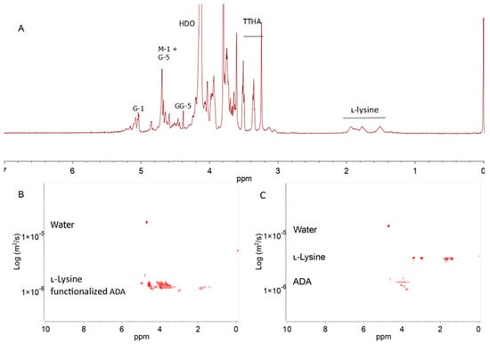 The 1H NMR spectrum (500 MHz, 90 °C) of l-lysine−functionalized ADA in D2O with the identification of the main signals. The spectral annotation of the alginate residue is given according to Grasdalen et al. [5] (A). The DOSY spectra of a mixture of non−covalently bound ADA and l-lysine (B) and l-lysine-functionalized ADA (C) in D2O recorded at 25 °C.