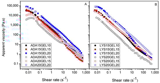 Apparent viscosity of ADA hydrogels (A), and l-lysine functionalized ADA hydrogels (B) with different amount of ADA/f−ADA and gelatin.