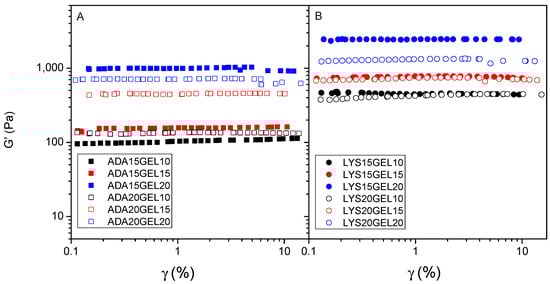 The frequency sweep tests were performed within the LVE, which was determined before this step, with increasing frequency rates ranging from 10−2 to 10−1 Hz (Figure S10). The storage (G′) and loss (G″) moduli were determined to monitor the mechanical properties of the viscoelastic materials. G′ is measured from the energy stored during the loading cycle, indicating its solid or elastic character, while G″ indicates the amount of energy dissipated during the loading cycle. A combination of both parameters gives insights into the Newtonian behavior of the hydrogels, viscoelastic behavior, and sol–gel transformation point [49]. Thus, according to Figure 5 and Figure S9, G′ in all samples is greater than G″, indicating that all samples have solid-like behavior. In all hydrogel samples, the value of these moduli was likely determined by the amount of gelatin in the hydrogel formula. Thus, two samples, ADA15GEL20 and LYS15GEL20, had significantly higher G′ values compared to the other samples, indicating that both samples have the most solid-like behavior. Comparing Figure 5A to Figure 5B, it is noticeable that the LYS GEL samples have higher storage modulus points (400–1150 Pa) than the ADAGEL samples (100–1000 Pa). This shows that the molecular weight of the alginate derivatives and l-lysine residue influence the modulus measurement. A lower molecular size reduces the entanglement between the polymer chains and provides more areas for crosslinking between alginate fragments and gelatin, leading to more crosslinking in the hydrogel sample.