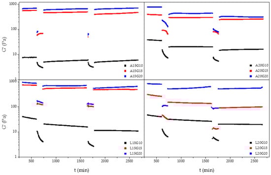 The thixotropic properties were studied using the rheological method mentioned above. Each loop test consisted of 3 steps: (1) the application of 1% strain at a frequency of 1 Hz for 5 min; (2) an increase in the shear strain to 400% to ensure the rupture of the gel, which was maintained for 2 min; (3) a reduction in the same rate to the initial strain, which was kept for 15 min to stabilize the gel network recovery. During these steps, the gel behavior was characterized by its storage and loss moduli (G′ and G″).