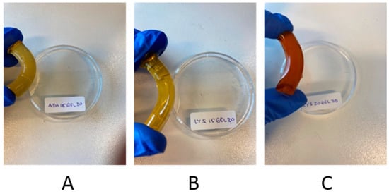 Photographs showing the resistance of self-healed hydrogels to bending: ADA15GEL20 (A); LYS15GEL20 (B); LYS20GEL20 (C).