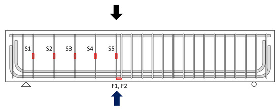 The shear tests of specimens were conducted using a universal testing machine (UTM, AceoneTech, Incheon, Republic of Korea). The specimens were placed on two simple supports, and a steel plate was located on the loading point of the specimen described above. Figure 3 shows the location of the linear voltage displacement transducers (LVDTs) and strain gauge for the test. LVDTs were installed below the loading point to observe the deflection of the specimens. Five strain gauges were attached to the stirrups in the test region to measure the strain of transverse reinforcement. The strain gauges for CFRP strain measurement were attached in the same position as the strain gauge attached to the stirrups in the test region. Additionally, two strain gauges were attached to the longitudinal reinforcement at the loading point. The loading of the test specimens was achieved under a monotonic loading protocol. The specimens were unloaded when the beams reached 85% of the maximum load in the post-peak loading range. The loading was controlled to increase the deflection at a rate of 0.01 mm/sec.