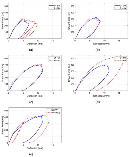 Load deflection behavior of specimens: (a) U1-SB vs. B1-SB; (b) U1-UW vs. B1-UW; (c) U1-FW vs. B1-FQ; (d) U1-FW vs. U2-FW; (e) B1-FW vs. B1-FW(2).
