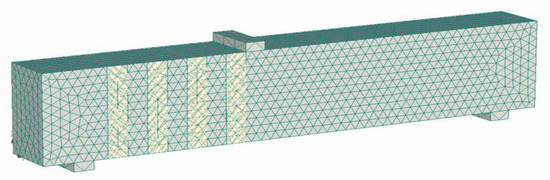 For the modeling of concrete, brick and tetra meshes with the size of 0.1 m were used. CFRP strips were modeled using brick and tetra meshes with a mesh size of 0.1 m. The isotropic linear elastic material model was applied to the CFRP modeling. Between the CFRP strips and the concrete, a 3D interface describing the properties of epoxy was modeled. The model was constructed based on the study of Kalfat and Al-Mahaidi [59].
