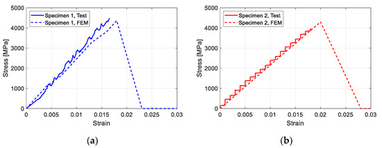 To validate the analysis model, the results of material tests and specimens from the previous study [39] were compared with the FEM model. Figure 7 shows the CFRP material test results of the FEM. In the figure, it can be seen that the FEM model showed similar load displacement behavior to the test result. Compared to the test result, the displacement of the FEM model still increased, even with a loading smaller than the maximum loading. This was caused by the displacement control mode used in the FEM. The FEM model would have shown a similar result to the test if the analysis had been performed based on the load control.