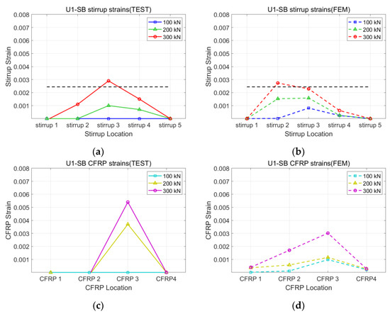 Strains of U1-SB specimen: (a) stirrup of test; (b) stirrup of FEM; (c) CFRP of test; (d) CFRP of FEM.