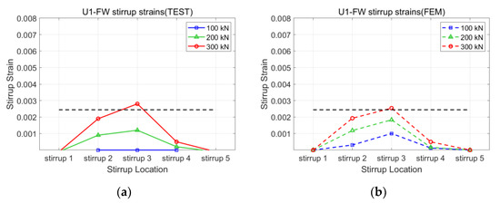 Figure 8, Figure 9, Figure 10 and Figure 11 present the strains of the stirrups and CFRP strips of the U1-SB, U1-FW, B1-SB, and B1-FW specimens at the different loading stages, respectively. The black, horizontal dash line represents the yielding strain of the stirrups. In Figure 8, it can be seen that the distribution of strains at different specimen locations in the FEM model was different from that in the experiment. However, the maximum stirrup strains at each loading stage were similar for both the FEM model and the experiment (0.0027 vs. 0.0029 at 300 kN). In Figure 9, the distribution of both stirrups and CFRP strains at different specimen locations in the FEM model was similar to that in the experiment. The fully wrapped CFRP configuration provides a more stable performance than the side-bonded configuration because the configuration provides a larger area of contact between the CFRP and the concrete beam. Furthermore, the fully wrapped configuration provides higher CFRP strains due to the continuing effect provided by the CFRP strips. Figure 10 and Figure 11, representing the results of the bidirectional CFRP layouts, show higher stirrup strains (0.0045 and 0.0039 at 300 kN) and lower CFRP strains (0.0043 and 0.0052 at 300 kN) compared to those in the unidirectional CFRP layouts. The overall results represent that the FEM model described the performance of the CFRP-strengthened beams well.