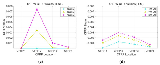 Strains of U1-FW specimen: (a) stirrup of test; (b) stirrup of FEM; (c) CFRP of test; (d) CFRP of FEM.