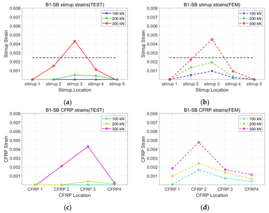 Strains of B1-SB specimen: (a) stirrup of test; (b) stirrup of FEM; (c) CFRP of test; (d) CFRP of FEM.